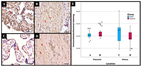 MMP-9 immunohistochemical staining results with different intensities in (A) placenta of PASD group: strong, (B) uterus of PASD group: moderate, (C) placenta of non-PASD group: moderate, and (D) uterus of non-PASD group: moderate. MMP-9 expression is characterized by brown staining in the cytoplasm and cell membrane (red arrow); light blue staining indicates hematoxylin-stained nuclei. Note the increased MMP-9 staining in the intervillous spaces compared to control tissues, suggesting enhanced proteolytic activity associated with PASD. (E) Comparison of mean immunostaining expression levels (percentage of positive cells) of MMP-9 in PASD and non-PASD groups. ***Mann–Whitney U test, p < 0.05 compared with the control group. Scale bar 500 µm; original magnification 400×. This figure was generated using Microsoft PowerPoint, Microsoft, Washington, DC, USA. All images presented were obtained exclusively for this study and have not been previously published or used elsewhere.