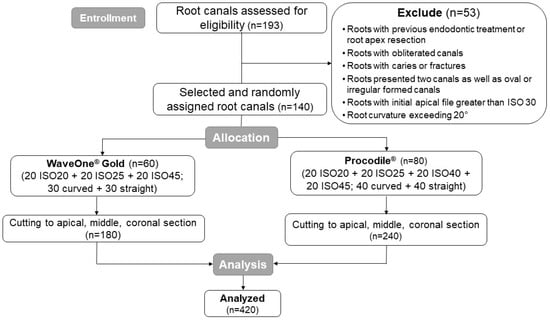 A power calculation with G*Power 3.1.9.7 for Windows (Heinrich-Heine University, Düsseldorf, Germany) was performed in order to calculate the minimum sample size required to detect relevant differences between both main groups (instruments) regarding the root canal morphology and section localization. Based on the main parameter t-test for independent groups, we required a mean difference of 5.0 (85 vs. 80, pooled SD: 9.0; d = 0.56), a significance level of 5%, a power of 80%, and a sample size of 52 samples in each group. Therefore, 52 samples were included in each instrument group. In the Procodile group, 20 samples were additionally included due to the four sizes available in the system.