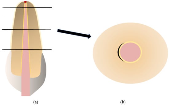(a) The root-filled tooth was sectioned at three levels (apical, middle, and coronal). (b) A schematic representation of sections under a microscope (magnification 6×): red—gutta-percha; yellow—sealer; black—voids.
