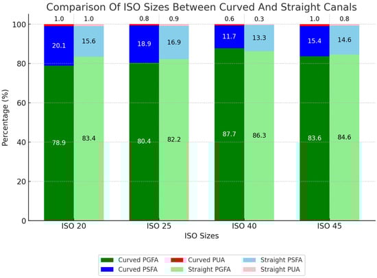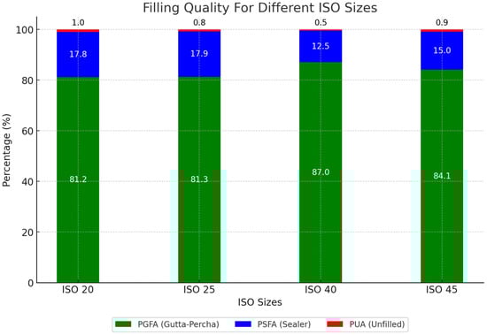 Within both curved and straight canals, significant differences in filling quality were observed for the tested ISO sizes. ISO 40 demonstrated the best results, achieving 88% PGFA, 12% PSFA, and 0.60% PUA in curved canals, and 86% PGFA, 13% PSFA, and 0.34% PUA in straight canals. ISO 45 had the second-best filling quality in both curved and straight canals, with 84% and 85% PGFA, respectively. The poorest results were observed with ISO 20 in curved canals, yielding 79% PGFA and 20% PSFA. In straight canals, ISO 25 showed the lowest performance with 82% PGFA and 17% PSFA, followed closely by ISO 20, which achieved 83% PGFA and 16% PSFA (Table 4, Figure 6).