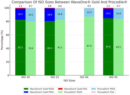 According to the Mann–Whitney test, the significant differences between the ISO groups can be attributed to notable differences between ISO 20 and 25 (U_value = 1281, Z_Score = −2.72, p = 0.006 for PGFA and U_value = 1264, Z_Score = −2.81, p = 0.005 for PSFA), as well as between ISO 25 and 45 (U_value = 1312, Z_Score = −2.56, p = 0.010 for PGFA and U_value = 1247, Z_Score = −2.90, p = 0.004 for PSFA), in the WaveOne® Gold system. Similarly, significant differences were found between ISO 20 and 40 (U_value = 1178.5, Z_Score = −3.26, p = 0.001 for PGFA and U_value = 1215.5, Z_Score = −3.07, p = 0.002 for PSFA), ISO 25 and 40 (U_value = 1234.5, Z_Score = −2.97, p = 0.003 for PGFA and U_value = 1288.5, Z_Score = −2.68, p = 0.007 for PSFA) and ISO 40 and 45 (U_value = 1197, Z_Score = −316, p = 0.002 for PGFA and U_value = 1243, Z_Score = −2.92, p = 0.003 for PSFA) in the Procodile® system (Table 3).
