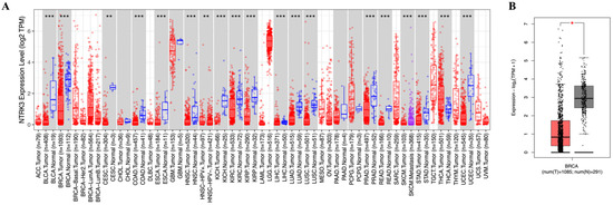 mRNA expression levels of NTRK3 in various types of cancer, including BC. (A) High or low expression of NTRK3 in tumor tissues compared with normal tissues analyzed using the TIMER database. (B) Low expression of NTRK3 in tumor tissues compared with normal tissues analyzed using the GEPIA2 database. * p < 0.05, ** p < 0.01 and *** p < 0.001.