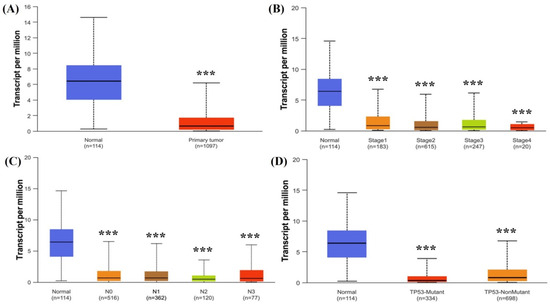 The UALCAN database is a web-based tool for cancer data analysis that utilizes The Cancer Genome Atlas (TCGA) Level 3 RNA-Seq data and clinical data. This tool enables users to analyze the relative expression of specific genes across both tumor and normal samples as well as across different tumor subgroups. These subgroups can be classified based on various clinicopathological features, such as sex, age, race, histological subtype, tumor stage, grade, nodal metastasis, and TP53 mutation status.