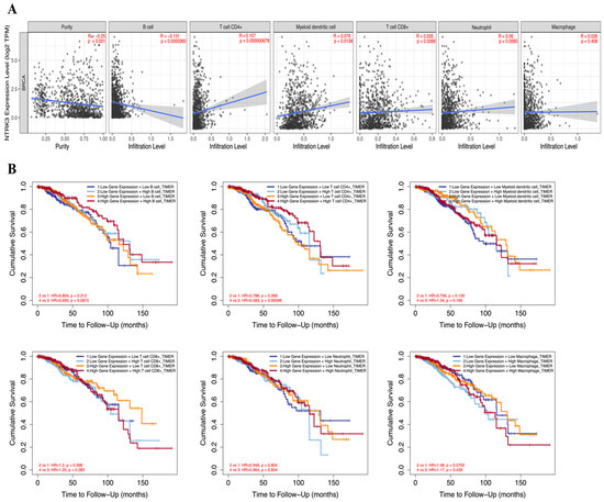 Correlation between NTRK3 expression and infiltrating immune cells in BRCA. (A) Scatterplots showing the correlation between NTRK3 and TIICs, including B cell, CD4+ T cells, dendritic cells, CD8+ T cells, neutrophils, and macrophages were analyzed using the TIMER database. (B) The prognostic value NTRK3 and TIICs was analyzed using the TIMER database.
