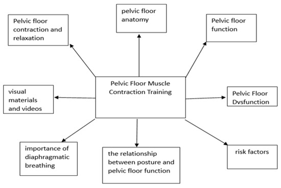 After the assessments, participants were provided with similar training regardless of the group they were assigned to. The training included detailed presentations on pelvic floor anatomy and function, pelvic floor dysfunction (PFD), risk factors, the relationship between posture and pelvic floor function, importance of diaphragmatic breathing, and pelvic floor muscle training. Additionally, visual materials and videos were used during the training. Pelvic floor contraction and relaxation techniques were explained according to the group to which the participants were assigned (Figure 1).