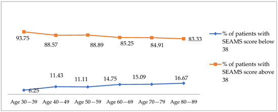 Percentage of patients with SEAMS score below 38 and above 38 per age group.