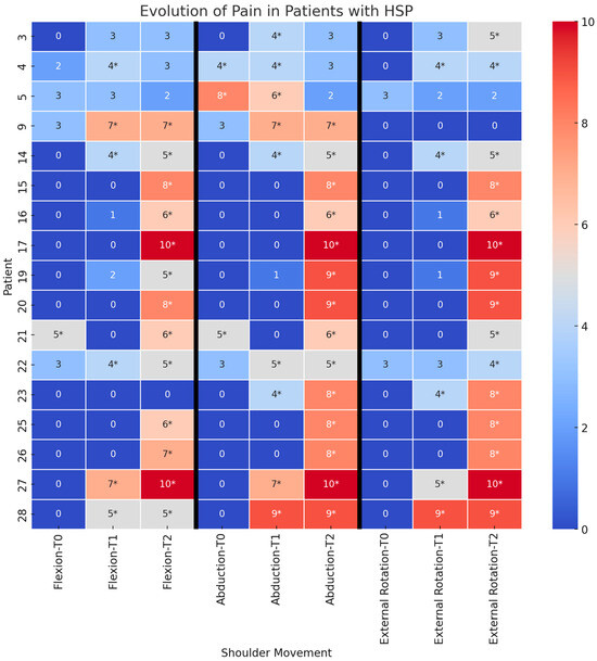 The heat map illustrates the evolution of shoulder pain in 17 patients diagnosed with hemiplegic shoulder pain (HSP). Pain intensity, measured using the Numerical Rating Scale (PNRS), is reported for three shoulder movements—flexion, abduction, and external rotation—at three assessment time points (T0, T1, and T2). Only pain scores greater than 3 (PNRS > 3) have been considered and marked with an asterisk, as this represents the diagnostic threshold for HSP. Warmer colors indicate higher pain levels, while cooler colors represent lower pain intensity.