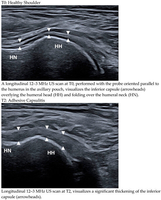 - Stella, S.M.; Gualtierotti, R.; Ciampi, B.; Trentanni, C.; Sconfienza, L.M.; Del Chiaro, A.; Pacini, P.; Miccoli, M.; Galletti, S. Ultrasound Features of Adhesive Capsulitis. Rheumatol. Ther. 2022, 9, 481–495. [Google Scholar] [CrossRef] [PubMed]