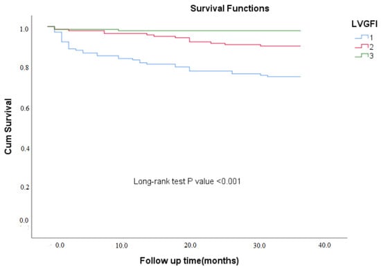 In our study, the LVGFI was selected over traditional indices, such as LVEF, as it provides a more comprehensive assessment of cardiac function. Unlike LVEF, which primarily evaluates systolic function, LVGFI integrates multiple dimensions of left ventricular performance, encompassing volumetric and functional parameters []. The advantages of LVGFI also extend to its sensitivity in detecting early or subclinical left ventricular dysfunction, which is often missed by traditional metrics []. In a study, Diaz-Navarro et al. [] characterized three patient groups, including acute myocarditis, takotsubo cardiomyopathy, and acute myocardial infarction, and found that the LVGFI offered incremental value over traditional metrics LVEF and GLS. Our study corroborates this advantage, as the LVEF did not differ significantly across tertiles, whereas LVGFI demonstrated significant predictive value for mortality and MACE.