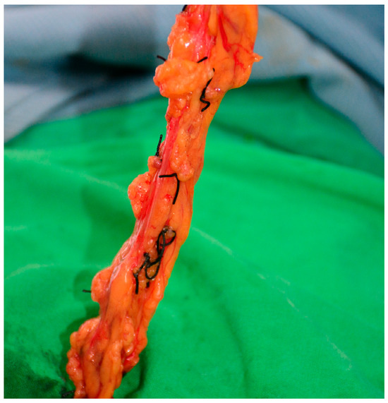 The gastroepiploic lymph node flap, harvested laparoscopically from the omentum, has proven to be an advantageous option due to its reduced donor-site morbidity and versatility [3]. It offers a minimally invasive approach that significantly lowers the risk of iatrogenic lymphedema in the upper or lower limbs, a potential complication when harvesting from superficial lymph node basins [9,10,11,12,13,14]. The gastroepiploic lymph node flap, with an average size of 3 × 7 cm, allows for placement in the distal areas of the extremity, maximizing the gravitational advantage in enhancing lymphatic drainage. Furthermore, studies have shown that the use of gastroepiploic lymph nodes leads to significant improvements in limb circumference, symptom relief, and patient satisfaction, with reductions in lymphedematous limb volume reaching up to 43.7% at follow-up [2,3].