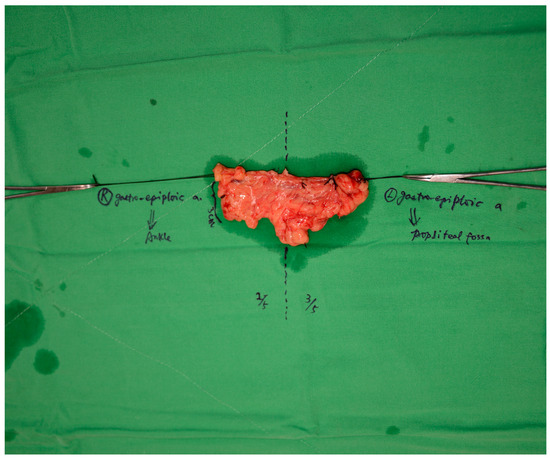 For the harvest of the right gastroepiploic vascularized lymph node (VLN) flap, the patients were positioned according to the affected limb: supine for lower limb lymphedema and with arms at 90° angles for upper limb lymphedema. The pneumoperitoneum was established using a supraumbilical 12 mm trocar, followed by the placement of two 5 mm trocars in the right and left upper quadrants. Reverse Trendelenburg positioning aids in visualizing the omentum and the right gastroepiploic vessels. Under the guidance of the plastic surgery team, an experienced laparoscopic surgeon performed meticulous dissection using a 5 mm LigaSureDolphin Tip Laparoscopic dissector. The right gastroepiploic vessels were carefully identified, and the omentum was freed from the stomach and transverse colon to preserve the surrounding lymphatic and vascular integrity. The harvested flap, approximately 15 cm long and 3–4 cm wide, was retrieved through an enlarged umbilical port and prepared under a microscope. It was divided into two different-sized flaps, with the vascular and lymphatic structures precisely ligated. See Figure 1 and Figure 2.