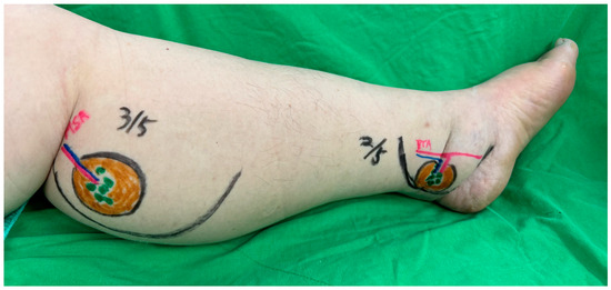 In the unilateral group, all the patients underwent vascularized lymph node transfer (VLNT), with supplementary suction-assisted lipectomy (SAL). The flap was divided into two distinct halves to optimize its use. The proximal half, which contains a higher density of lymph nodes, was always positioned at the ankle to maximize lymphatic function in this critical area, while the distal half was consistently placed at the level of the knee. Vascular anastomoses were carefully performed to ensure reliable perfusion of the flap. In the popliteal fossa, the medial sural artery and vein were connected to the flap vessels in an end-to-end configuration. At the ankle, the vascular connections were established using an end-to-side technique with the posterior tibial artery and vein, ensuring adequate perfusion. This approach allowed for the precise placement of the lymph node-rich segment of the flap at the ankle in all cases while ensuring the distal segment was effectively positioned at the knee.