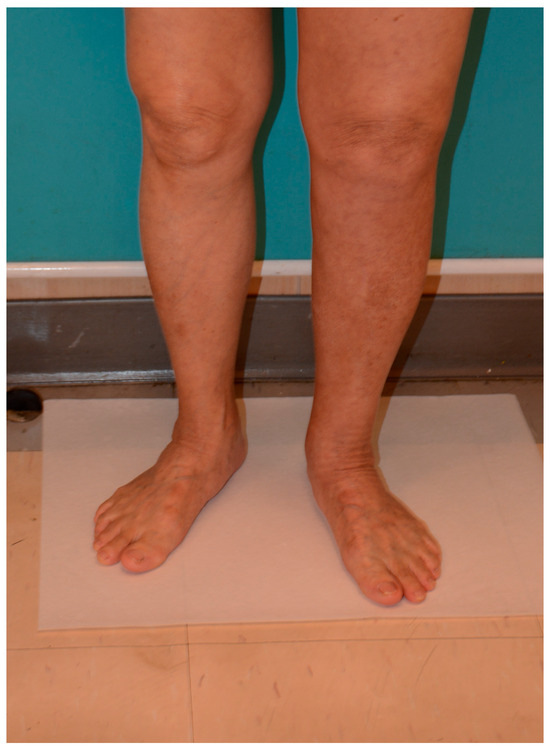 The 56-year-old woman was operated for cervical cancer 5 years ago. She developed lymphedema of the left lower limb 3 years later. This was the anterior view. The circumference measurements of bilateral lower limbs were 49.5 (right)/56 (left) cm at the level of mid-thigh; 37.5 (right)/40.5 (left) cm at the level of mid-leg; 21 (right)/22.5 (left) cm at the level of the ankle; and 22 (right)/22.5 (left) cm at the level of the foot.