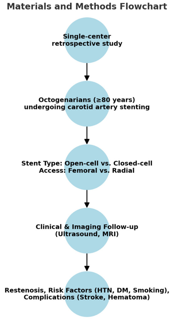 Flowchart illustrating the study design and methodology. The process begins with a single-center retrospective study on octogenarians (≥80 years) undergoing carotid artery stenting. Procedural details include the use of open-cell vs. closed-cell stents and femoral vs. radial access. Follow-up involves clinical and imaging assessments (ultrasound, MRI). Outcome assessment includes restenosis rates, risk factors (hypertension, diabetes, smoking), and complications such as stroke and hematoma.