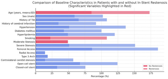A comparison of baseline characteristics between patients with and without in-stent restenosis revealed significant differences in several variables (Figure 2). Patients who developed in-stent restenosis were significantly older (mean ± SD) compared to those without restenosis. Additionally, smoking history and the presence of hyperlipidemia were more prevalent in the restenosis group. Regarding the severity of initial stenosis, moderate stenosis was observed more frequently in patients who later developed in-stent restenosis. However, severe stenosis showed no significant difference between the two groups. Sex distribution, history of TIA, history of cerebral infarction, hypertension, and diabetes mellitus did not exhibit significant differences between the restenosis and no-restenosis groups. Similarly, anatomical and procedural factors, such as femoral or radial access, the presence of a type 3 aortic arch, contralateral carotid stenosis, and stent design (open-cell vs. closed-cell), were comparable between the two groups.