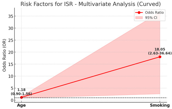 This figure illustrates the multivariate analysis of risk factors for ISR, displaying the odds ratio (OR) values along with their 95% confidence intervals (CI). The red line represents OR values for each risk factor, while the shaded area indicates the corresponding 95% CI. The black dashed line at OR = 1 serves as a reference point, representing no increased risk. Smoking is identified as a significant risk factor for ISR (OR: 18.05; CI: 2.63–36.64), with an 18-fold higher risk in smokers. The wide confidence interval reflects variability, but the p-value (0.006) confirms statistical significance. In contrast, age is a weaker risk factor (OR: 1.18; CI: 0.90–1.56), showing a mild increase in ISR risk with aging. However, its confidence interval includes 1, indicating lower statistical significance. This figure highlights the strong association between smoking and ISR compared to the relatively minor influence of age.