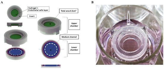 A schematic diagram of the respiratory mucosa-on-a-chip model developed in this study (A), and the device placed in the well of a 12-well plate (B).