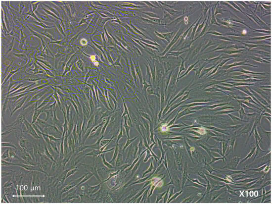 The process of isolating hNTSCs from the collected turbinate tissues involved multiple steps to maintain sterility and optimal cell viability. First, the tissue samples were subjected to extensive washing to remove contaminants and minimize the risk of microbial infection. Specifically, the samples were rinsed three to five times using an antibiotic–antimycotic solution (Gibco, Gaithersburg, MD, USA) to eliminate potential bacterial or fungal contaminants. After this initial decontamination step, the tissues underwent two additional washes with phosphate-buffered saline (PBS) to ensure the removal of residual antibiotic solution and any remaining impurities. Following the washing process, the tissues were carefully cut into small fragments, each measuring approximately 1 mm3. This fragmentation process was conducted to facilitate the subsequent attachment and expansion of stem cells in culture. The prepared tissue fragments were transferred into culture dishes that had been pre-coated with CELLstart Substrate (Gibco) to optimize cell adherence and proliferation. To ensure stability and prevent displacement during the early stages of culturing, a sterilized glass coverslip was placed over the tissue fragments. Once the tissue fragments were securely positioned, a culture medium was introduced to support stem cell growth. The culture medium used was StemPro MSC SFM XenoFree (Gibco), a specialized serum-free medium designed for MSC expansion. Additionally, the medium was supplemented with 200 mM L-glutamine (Gibco) to enhance cell viability and metabolic activity. The culture medium was changed every other day to maintain a nutrient-rich environment and remove metabolic waste.