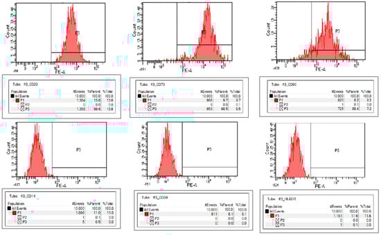 Flow cytometry was used to assess the expression of specific cell surface markers in hNTSCs, providing insights into their immunophenotypic characteristics. To prepare the cells for analysis, they were suspended in PBS at a density of 1 × 105 cells/mL. This standardized concentration ensured consistency across samples and facilitated accurate comparative analysis. To eliminate any residual culture medium, unbound proteins, or debris that could interfere with antibody binding, the cells were subjected to three sequential washes with PBS. This washing process helped to improve the specificity and reliability of the staining procedure. Following preparation, the cells were incubated for 1 h with primary monoclonal antibodies targeting key surface markers. These markers were selected based on their relevance to characterizing MSCs and distinguishing MSCs from hematopoietic or immune cell populations. The antibodies were applied at saturating concentrations to ensure maximal binding and to prevent variability in signal intensity. All anti-human cluster of differentiation (CD) antibodies used in this study were obtained from BD Biosciences (San Jose, CA, USA), a reputable supplier of high-quality flow cytometry reagents, to ensure the consistency and reliability of the results. After primary antibody incubation, the cells were washed an additional three times with buffer to remove any unbound antibodies and reduce background fluorescence. This step was critical, as it ensured that the fluorescence signals detected during flow cytometry represented bound antibodies rather than non-specific interactions. The washed cells were then subjected to centrifugation at 400× g for 5 min to produce a pellet of concentrated cells for further processing. The pellet was gently resuspended in ice-cold PBS to maintain cellular integrity and prevent degradation. To promote secondary antibody binding and enhance fluorescence signal detection, the cells were incubated with secondary antibodies for 30 min in the dark at 4 °C. This incubation was conducted in the dark to prevent photobleaching, which could otherwise diminish fluorescence intensity and thus compromise data accuracy. This step ensured that the labeled antibodies remained intact and provided a reliable fluorescence signal for subsequent analysis. Flow cytometry was performed using a FACSCalibur flow cytometer (BD), which enabled the detection and quantification of fluorescence signals corresponding to each surface marker, providing a detailed profile of the hNTSCs’ immunophenotypic characteristics. The acquired data were processed and analyzed using CellQuest (Ver. 6.0) software (BD), which facilitated graphical representation and statistical evaluation of marker expression. Through this rigorous analytical approach, the present study aimed to comprehensively assess the surface marker profile of hNTSCs and confirm their MSC properties.
