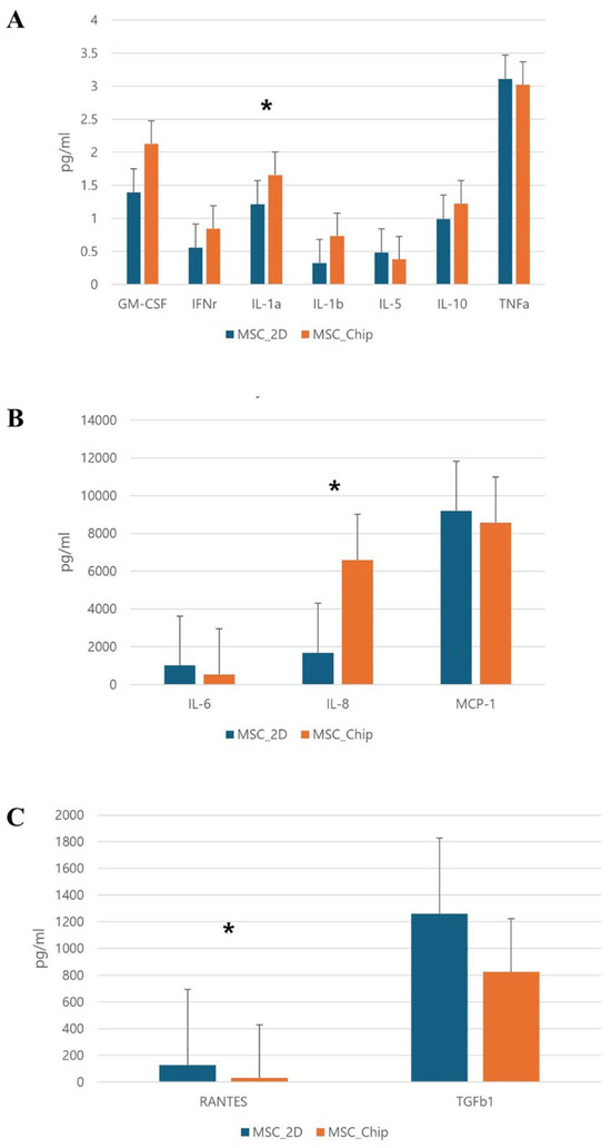 We investigated the secretion profiles of various immunomodulatory cytokines and chemokines, including GM-CSF, IFN-γ, IL-1α, IL-1β, IL-5, IL-10, RANTES, TNF-α, IL-6, IL-8, MCP-1, and TGF-β1 (Figure 4). Among these, GM-CSF, IL-1α, IL-10, RANTES, TNF-α, IL-6, IL-8, MCP-1, and TGF-β1 were detected in measurable quantities in hNTSC supernatants from both experimental groups, with average concentrations exceeding 1 pg/mL. However, significant differences in secretion levels were found between the lab-on-a-chip and control groups for some cytokines and chemokines. The lab-on-a-chip group exhibited increased secretion of IL-1α and IL-8 compared to the control group. Notably, IL-8 levels were approximately four times higher in the lab-on-a-chip group, while RANTES secretion was about four times lower in the lab-on-a-chip group compared to the control (Figure 4). These results suggest that culture methods can influence the immunological response of hNTSCs.