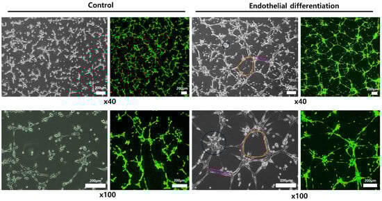 Endothelial differentiation potential of hNTSCs. hNTSCs were cultivated under non-differentiation (left) and endothelial differentiation (right) conditions in conventional 2D culture for 3 weeks. Under differentiation conditions, the formation of cord-like structures was visualized through phase-contrast microscopy and immunofluorescence staining. Upon more detailed morphological examination, tubes (dotted purple lines), loops/meshes (orange circles), and nodes (blue circles) in the tube network could be identified in both images (from a single donor).