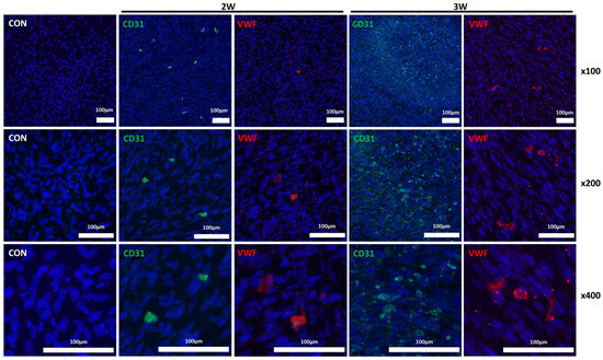 To stain hNTSCs, the paraffin sections were deparaffinized, followed by rehydration with ethanol solutions to prepare the tissues for subsequent analysis. To expose the antibody-binding sites, antigen retrieval was conducted using a proteinase K solution (Abcam, Cambridge, UK). Then, the samples were incubated with primary antibodies targeting key endothelial markers, including anti-CD31, anti-CD34, anti-VE-cadherin, anti-VEGFR-2, and anti-VWF sourced from either rabbit or mouse. The sections were then incubated with secondary antibodies conjugated to fluorescent dyes, namely Alexa Fluor 546 (green) or Alexa Fluor 488 (red), corresponding to the species of the primary antibodies (goat anti-rabbit IgG or goat anti-mouse IgG, respectively, diluted at 1:1000). This staining method enabled the visualization of endothelial markers within the tissue samples, providing valuable insights into cellular composition and the endothelial differentiation processes. Fluorescent quantification was measured using the ImageJ (https://imagej.net/, accessed on 3 March 2025) program.