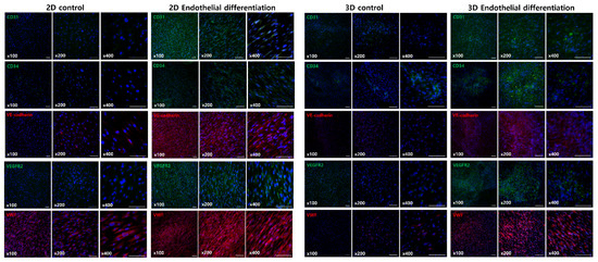 Immunofluorescence staining of CD31, CD34, VEGFR-2, VE-cadherin, and VWF. hNTSCs differentiated under lab-on-a-chip conditions included more immunofluorescence-stained cells compared to the control group. This pattern was similar to the result obtained using conventional differentiation methods with cells from a single donor.