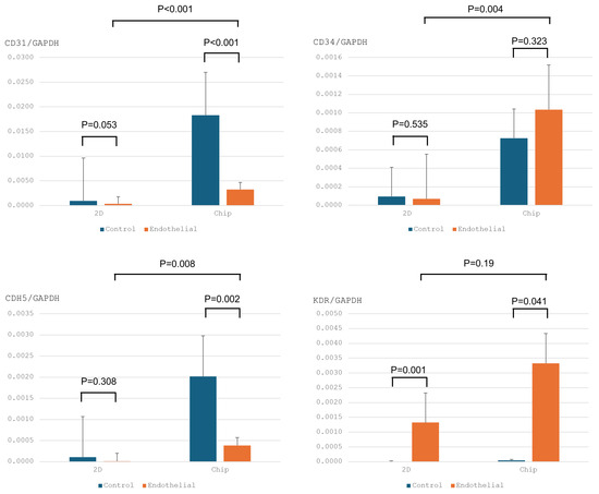 To assess the effectiveness of differentiation protocols, hNTSCs were exposed to endothelial differentiation conditions used in standard 2D culturing for 3 weeks. The formation of cord-like structures was examined through phase-contrast microscopy and immunofluorescence staining. Both methods showed a network of tubes, loops, mesh structures, and nodes. In contrast, hNTSCs cultured in a non-differentiation medium did not form tube networks (Figure 5). Importantly, after 3 weeks of differentiation, both the total cell count and the number of cells exhibiting immunofluorescence staining were higher than at the 2-week mark (Figure 6 and Figure S1). These results suggest that 3 weeks is an ideal period under differentiation conditions for endothelial differentiation. To determine the capacity of expanded hNTSCs from both groups to differentiate into ECs, histological methods were used to examine endothelial markers, including CD31, CD34, VE-cadherin, VEGFR-2, and VWF (Figure 7 and Figure S2). Immunofluorescence staining confirmed that endothelial differentiation conditions led to the expression of these markers in cell monolayers originating from both groups. Additionally, RT-PCR was employed for quantitative analysis of gene expression related to differentiation. Cells cultured in differentiation medium showed elevated mRNA levels of EC-specific markers, including CD34, KDR, CDH5 (VE-cadherin), and CD31. Specifically, CD31, CD34, and CDH5 exhibited significant upregulation in the lab-on-a-chip group compared to the control group (Figure 8).