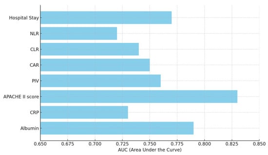 There are also limited studies showing the association of inflammatory markers such as PIV, CAR, CLR, and NLR in predicting mortality [24,27,28,29]. Huang et al. reported that PIV is a valuable prognostic tool for critically ill patients, particularly in predicting outcomes in sepsis and systemic inflammation [30]. Cakin et al. reported that NLR is a reliable parameter in predicting mortality by reflecting the balance between inflammation and immune response [27]. Ntalouka et al. showed that the combination scores of NLR and CLR, based on admission values, are promising predictors for mortality in patients suffering from severe COVID-19 infection [19]. In our study, PIV, which integrates immune cell counts and inflammatory markers, showed strong predictive power in our study, with an AUC of 0.76. Similarly, both NLR and CLR showed significant associations with mortality, with AUC values of 0.72 and 0.74, respectively.