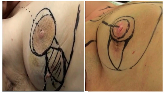 While the patient is standing, preoperative markings are created. First, an encircling safety margin is used to indicate the location of the tumor in the breast (Figure 1). Both the surrounding peri-areolar de-epithelization region and the NAC are marked. An ellipse around the previously marked tumor is drawn from the NAC to the inframammary fold (IMF) with equal limbs.