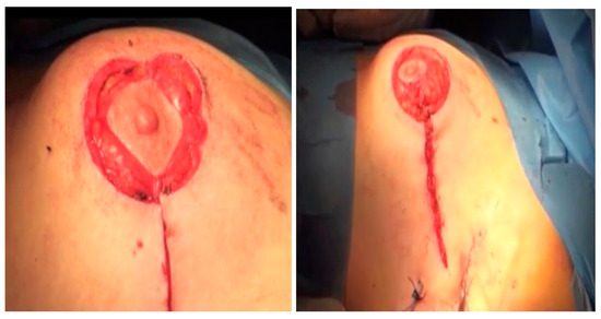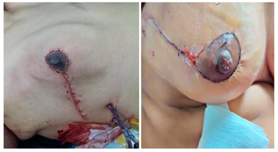 Axillary surgery is performed in the form of an SLNB and, in cases of a positive SLNB axillary dissection, a level I or II axillary lymph node dissection (ALND) is performed. Axillary surgery is performed using the same incision or a separate axillary incision whenever needed. The NAC is repositioned to its new position on a reliable central pedicle to maintain vascularity and sensation (Figure 3 and Figure 4). The clavipectoral fascia is closed again to separate the breast cavity from the axillary cavity, if an axillary lymphadenectomy was performed from the same breast incision, keeping the glandular seroma desired for breast reshaping. Central, lateral, and medial dermo-glandular flaps are approximated to close the defect. A drain is left in the cavity if needed after proper glandular approximation and another limb of the drain is left in the axilla if an axillary dissection is performed. Contralateral breast summarization was carried out for some patients who sought mastopexy and summarization. This was performed through the peri-areolar de-epithelization of the peri-areolar area in a circumferential manner as a minor mastopexy near the pathological side.
