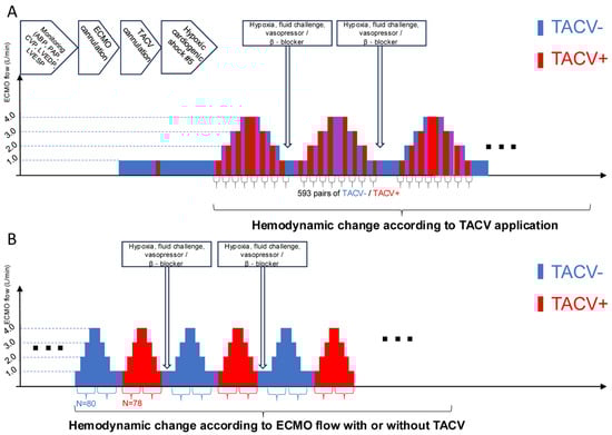 Procedure sequence and protocols of data acquisition. (A) After initial induction of acute hypoxic biventricular dysfunction, hemodynamic parameters were measured while the TACV was turned on and off in every extracorporeal membrane oxygenation (ECMO) flow. (B) Hemodynamic parameters were measured while ECMO flow was changed up and down between 1 L/min and 4 L/min with TACV (TACV−) or without TACV (+). ABP, arterial blood pressure; CVP, central venous pressure; LVEDP, left ventricular end-diastolic pressure; LVESP, left ventricular end-systolic pressure; MPVS, Millar Pressure-Volume System; PAP, pulmonary artery pressure.