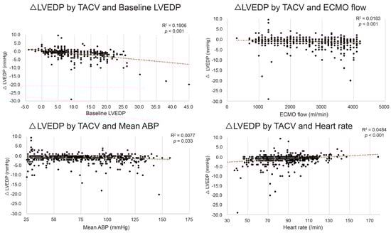 Change in left ventricle end-diastolic pressure (ΔLVEDP) by transaortic catheter venting (TACV) application according to baseline LVEDP, extracorporeal membrane oxygenation (ECMO) flow, mean arterial blood pressure (ABP), and heart rate. The decrease in LVEDP was more prominent when baseline LVEDP, ECMO flow, and mean ABP were higher, and heart rate was lower. The red dashed lines represent the linear trend lines.