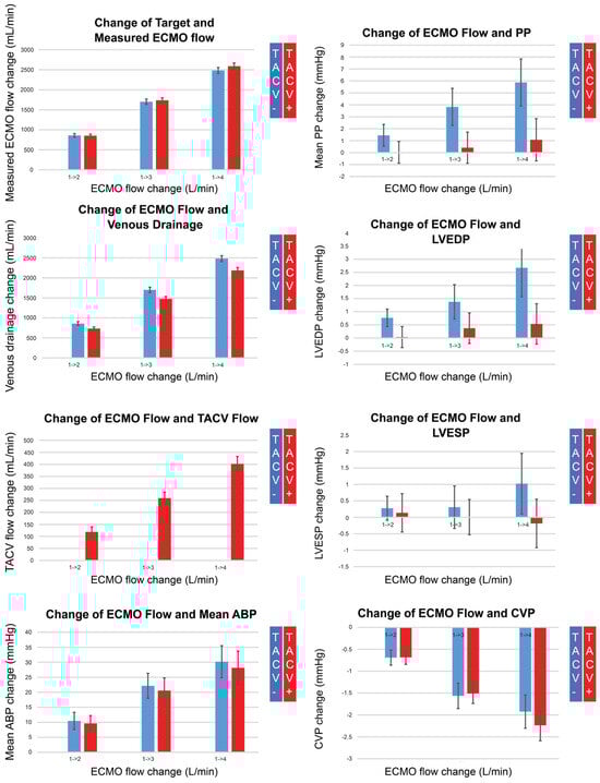 Under controlled numbers of hypoxic injury, volume challenge, norepinephrine, and labetalol infusion status, hemodynamic measurements were collected while ECMO flow was changed up and down from 1 L/min to 4 L/min by 1 L/min without (n = 80) or with TACV (n = 78) (Figure 2B). Changes in measurements compared with baseline when the ECMO flow was 1 L/min were analyzed (Table 4, Figure 4 and Figure A1).