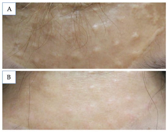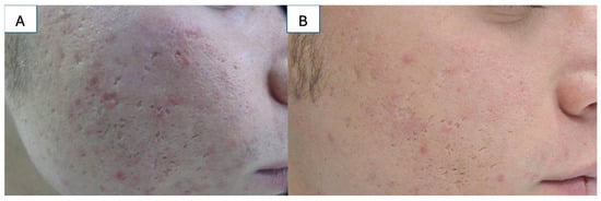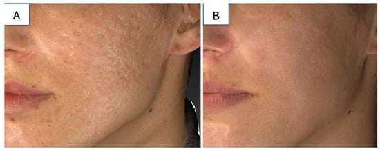(A) Atrophic scarring on the face; (B) the same patient 6 months after fractional CO2 laser treatment. Source: Textbook on Scar Management: State of the Art Management and Emerging Technologies, Chapter 41. Ref. [].