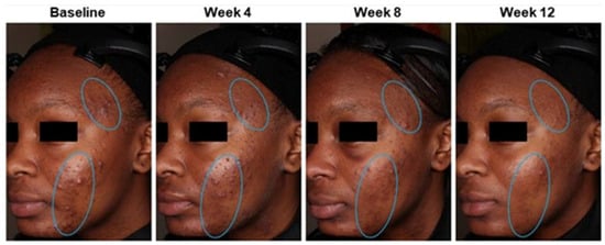 Acne hyperpigmentation (indicated by circled areas) improvements in a 15-year-old who was treated with tazarotene 0.045% lotion once daily for 12 weeks. Source: Effects of Topical Retinoids on Acne and Post-inflammatory Hyperpigmentation in Patients with Skin of Color: A Clinical Review and Implications for Practice. Ref. [].