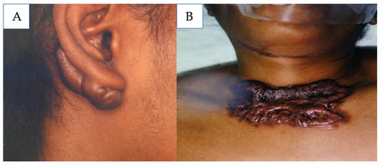 (A) Earlobe keloid; (B) chest keloid. Source: Textbook on Scar Management: State of the Art Management and Emerging Technologies, Chapter 9. Ref. [].