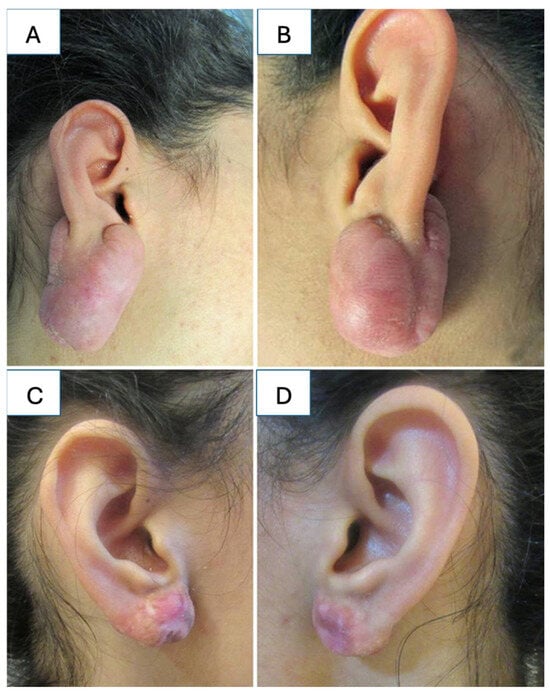 (A,B) Earlobe keloids; (C,D) post-operative view 6 years following a single cryosession of intralesional cryosurgery demonstrating complete involution of the scars with no distortion of the lobules and without hypopigmentation or recurrence. Source: Textbook on Scar Management: State of the Art Management and Emerging Technologies, Chapter 28. Ref. [].