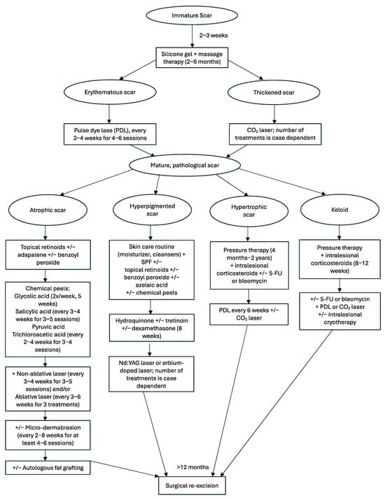 It is universally accepted that all full-thickness surgical incisions result in the formation of a scar []. However, all scars are not the same. Immature scars, typically less than one year old, can become erythematous or thickened. These scars occur soon after initial injury and are predominantly composed of inflammatory cells. Mature scars are typically older than one year old, and in ideal cases, heal as thin pencil lines with minimal color difference between the scar and areas of surrounding skin (Figure 1) []. In less ideal cases, atrophic scars, hyperpigmentation, hypertrophic scars, or keloids may result. While no outcome can be guaranteed and multiple factors influence scar cosmesis, strict adherence to evidence-based principles may help surgeons minimize suboptimal scar appearance in their patients []. Scar cosmesis must be especially maximized in children as these scars will be present as they form their self-perceptions and begin socializing with others. Scars in children also grow proportionally to the child, becoming more prominent and unsightly as they age. In this narrative review, we propose an evidence-based algorithm for the management of various scar types from incision planning to last-resort scar revision surgery in the pediatric population.