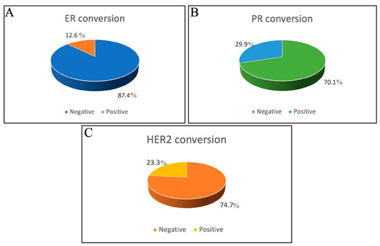 Pie charts represent the percentage of hormonal receptor and HER2 status conversion in this study’s participants. (A) Estrogen receptor (ER), (B) progesterone receptor (PR), (C) human epidermal growth factor receptor 2 (HER2).