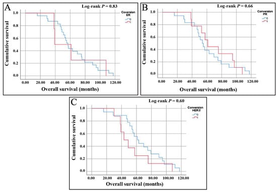 Kaplan–Meier curves showing OS based on receptor conversion status for (A) estrogen receptor (ER), (B) progesterone receptor (PR), and (C) human epidermal growth factor receptor 2 (HER2). The x-axis represents time, while the y-axis shows cumulative survival probability, ranging from 1 (100%) at the start of the study (when all patients are alive) to 0 (0%) when all patients have experienced death.
