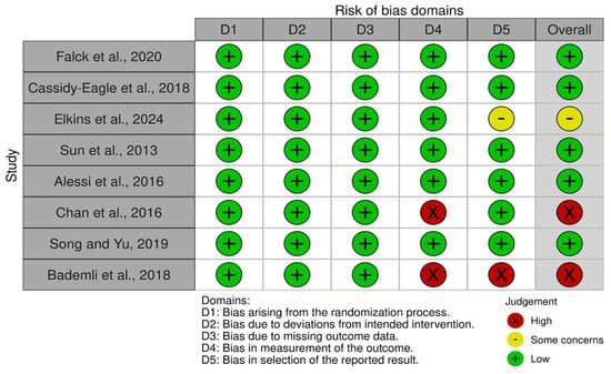 | [42] | CN | RCT | Participants diagnosed with MCI | EG: 60 CG: 60 | 75.78 years old | Moderate-intensity aerobic exercise training vs. General education program | 16 | 3 | 60 | Moderate | QOL-AD-C | MOCA | PSQI | EG: ↑Significant improvement in cognitive function (p < 0.001) compared to the CG. EG: ↑ Significant improvement in quality of life (p < 0.001) compared to the CG. EG: Changes in sleep quality: ↑ The treatment group had a significant improvement in sleep quality compared to the CG (p < 0.001). |