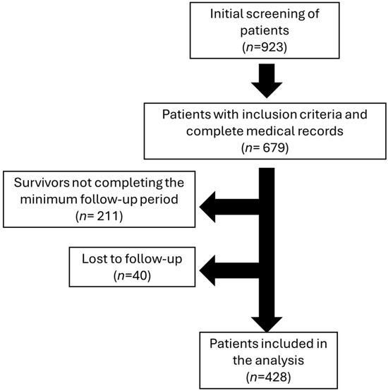 Initially, 923 patients were screened, of whom only 679 were included because they had a complete medical record. After the evaluation period was over, 211 survivors were eliminated because they did not complete the minimum follow-up period required, which was 7 years. Forty patients were lost to follow-up. A total of 428 patients on hemodialysis were included in the analysis (Figure 1), with the majority having a tunneled catheter (53.0%, n = 227), followed by AVF (27.8%, n = 119) and non-tunneled catheter (19.2%, n = 82). The average age was 58.39 years (SD 15.53), with 38.6% of patients being women. Age was significantly lower in patients with AVF (51.75 years, SD 15.59) compared to those with a tunneled catheter (60.78 years, SD 14.99, p < 0.001) or non-tunneled catheter (61.43 years, SD 14.13, p < 0.001).