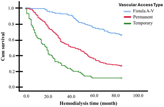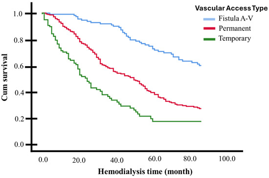 These findings reinforce the urgent need to minimize catheter use and to transition patients with tunneled catheters to AVF whenever feasible, particularly in those with comorbid conditions that further compromise survival. The survival advantage of AVF observed in this study aligns with prior research, which has consistently established AVF as the preferred vascular access for hemodialysis due to its lower risks of complications, including infections, thrombosis, and other adverse events [17,25,26,39]. Conversely, the high mortality rates observed in patients with tunneled and non-tunneled catheters reflect the significant risks associated with catheter use, particularly catheter-related bloodstream infections (CRBSIs) and poor hemodynamic performance [28,32,40].