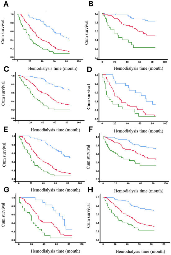 Adjusted survival curves (in months) based on vascular access and the presence or absence of significant risk factors. Panels represent survival stratified by different conditions: (A) diabetic patients, (B) non-diabetic patients, (C) hypertensive patients, (D) non-hypertensive patients, (E) patients aged ≥ 60 years, (F) patients aged < 60 years, (G) patients with hospitalization, and (H) patients without hospitalization. Vascular Access Type: AVF (blue line), Permanent (red line) and Temporary (green line).