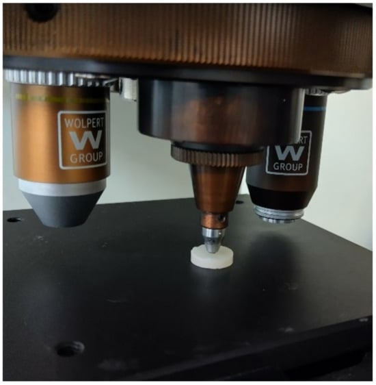 Microhardness was assessed using the Vickers method. The testing instrument, equipped with a diamond pyramid-shaped indenter, was configured with a load of 50 g and an indentation duration of 10 s. The sample was securely positioned during testing, and the indentation was performed under the specified parameters (