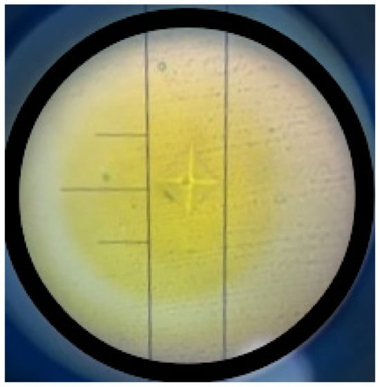Figure 3 presents an indentation mark obtained from the Vickers microhardness test, showing a well-defined impression on the specimen surface. The crosshair and calibration lines aid in accurately measuring the indentation’s diagonal length, essential for calculating the Vickers hardness value. The uniformity and clarity of the indentation reflect the material’s response to the applied load, providing insights into its mechanical properties.
