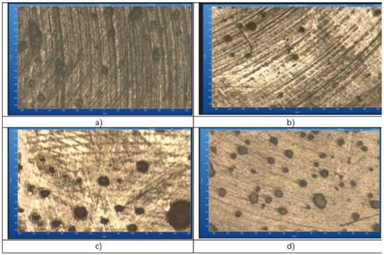 To ensure measurement accuracy and account for potential surface variations, three indentations per specimen were performed at different locations, following standard Vickers microhardness testing protocols. The microhardness value for each specimen was calculated as the mean of these three measurements. This approach enhances the reliability of the results by minimizing localized inconsistencies and ensuring a representative assessment of each composite material’s surface hardness.