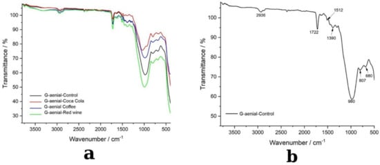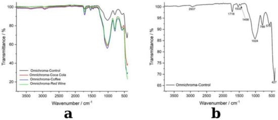 For both the control and immersed composite samples, Fourier Transform Infrared (FTIR) spectroscopy was performed using an IRTracer-100 Fourier Transform Infrared Spectrophotometer (Shimadzu Corporation, Kyoto, Japan) with Spectrum IRTracer-AIM-9000 software (v.2.27) for data acquisition and analysis. This method enabled a comprehensive analysis of the chemical structures and interactions within the resin composites. FTIR spectra were collected in the range of 4000–400 cm−1 with a resolution of 4 cm−1, ensuring high accuracy and sensitivity in detecting molecular vibrations and functional group changes. The instrument utilized a diamond ATR (Attenuated Total Reflectance) accessory to facilitate non-destructive sampling and ensure reproducibility. The analysis was performed to identify structural modifications caused by immersion in staining solutions (coffee, red wine, and Coca-Cola) by comparing the spectra of the control and exposed samples. Distinct peaks corresponding to ester, carbonyl, and aromatic group vibrations were monitored to assess the impact of chemical interactions between the resin matrix and the staining agents. Data collection was performed after 20 recordings at a resolution of 4 cm−1, in the range of 4000–400 cm−1 on the Shimadzu IRTracer-100 FTIR spectrometer with ATR using AIM-9000 software.