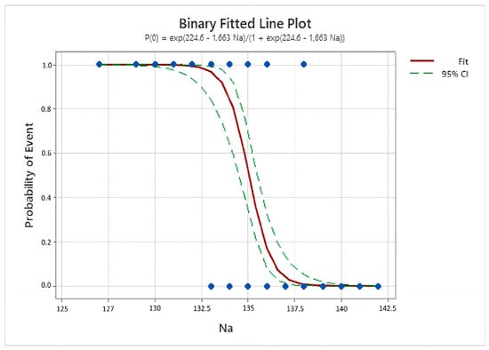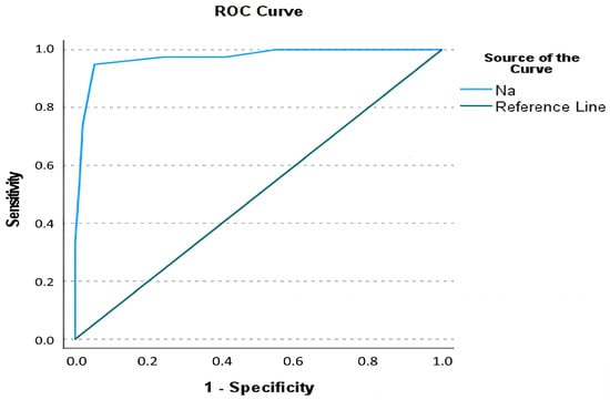 A multivariate logistic regression analysis was performed to determine if sodium levels were an independent predictor of complications in diverticulitis after controlling for confounders, such as gender and age. Gender was not found to be a significant predictor as it was also in the univariate analysis (p = 0.462). Although significant in the univariate analysis, age lost its significance and did not show statistical significance as a predictor in the multivariate analysis (p = 0.683). The binomial logistic regression model accurately classified 94.8% of the cases (Nagelkerke R2 = 0.808, p < 0.001) (Figure 1). Serum sodium levels were identified as a significant independent predictor of complications, even after adjusting for confounders (p < 0.001). For each unit decrease in Na levels, the odds of complications increased by approximately 5.7 times (ExpB: 5.675, 95% CI: 2.764–11.652, p < 0.001) (Table 1).